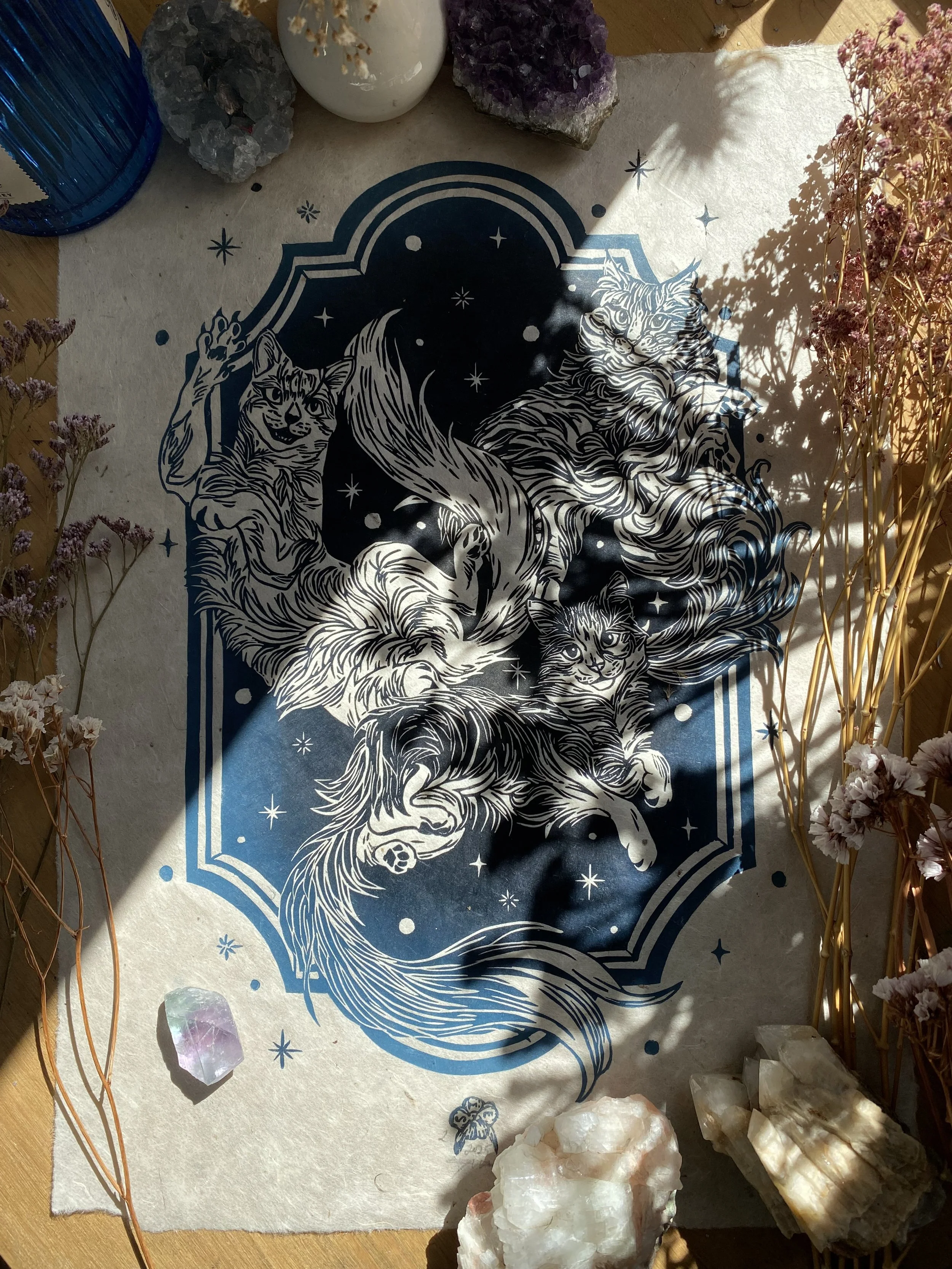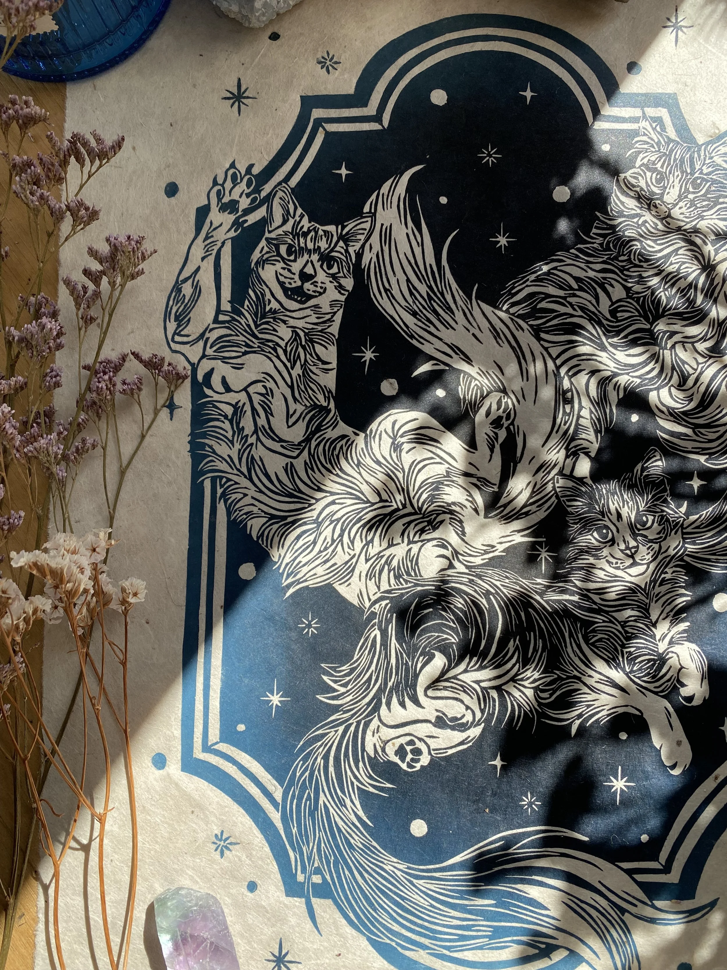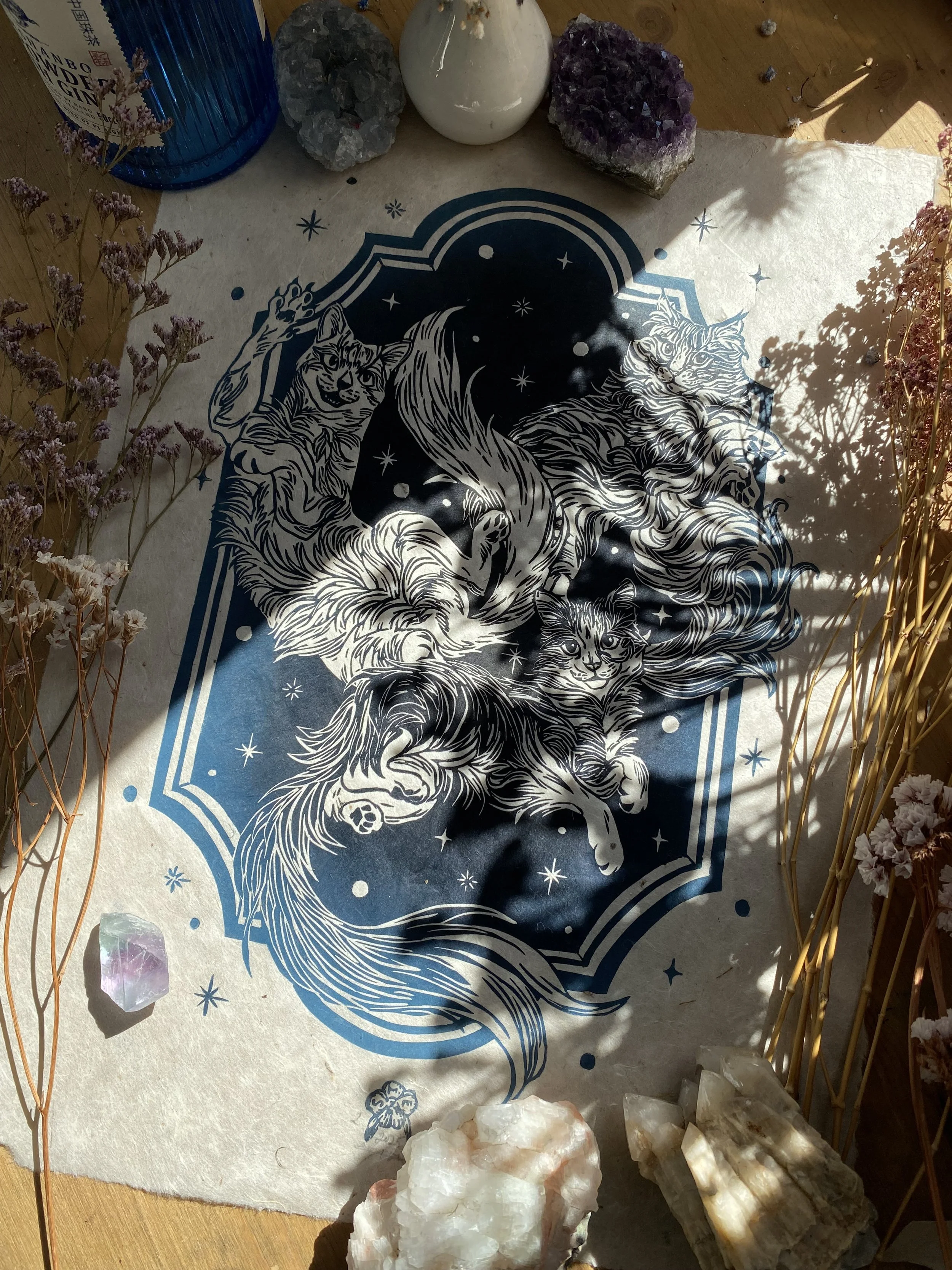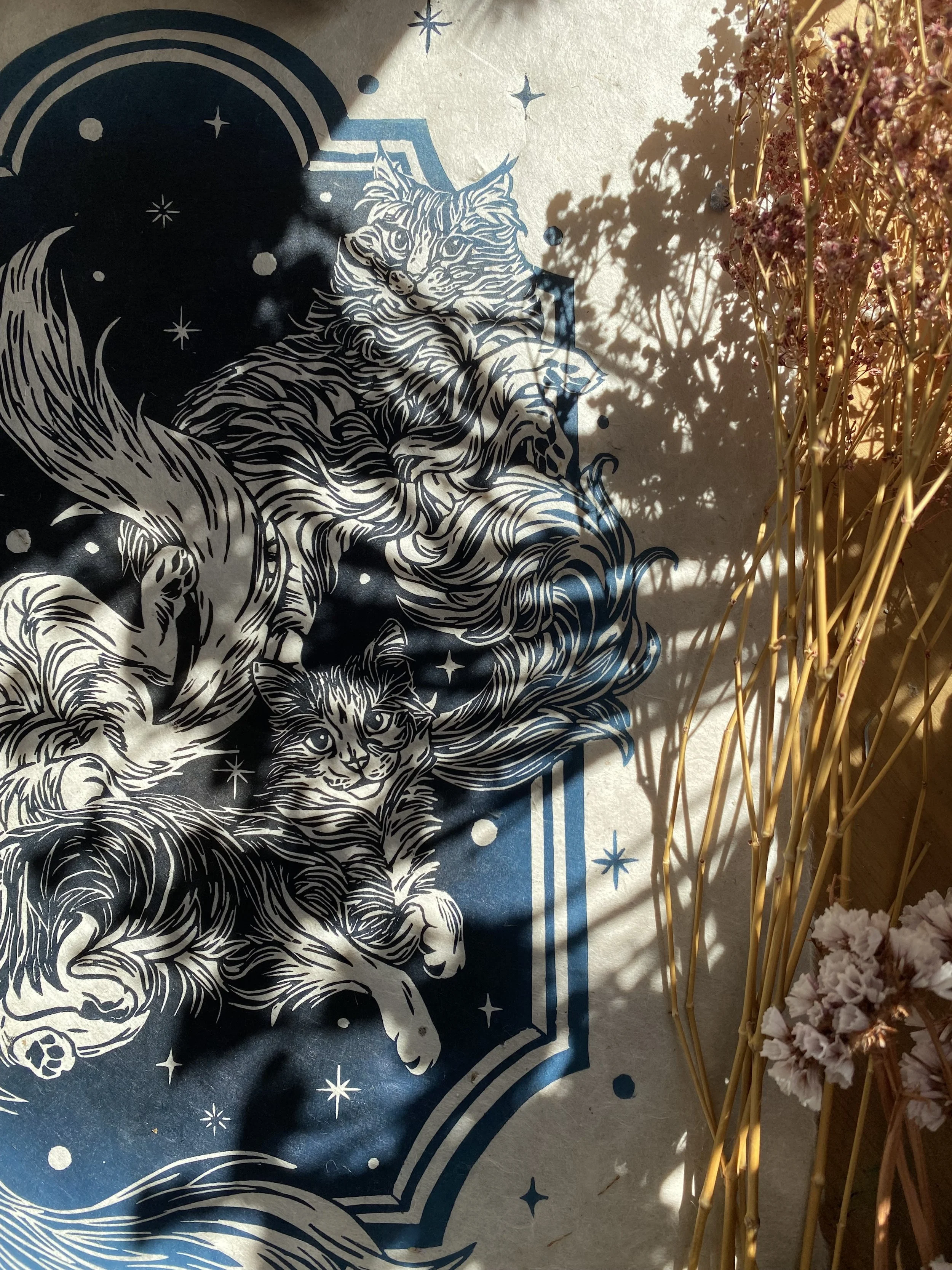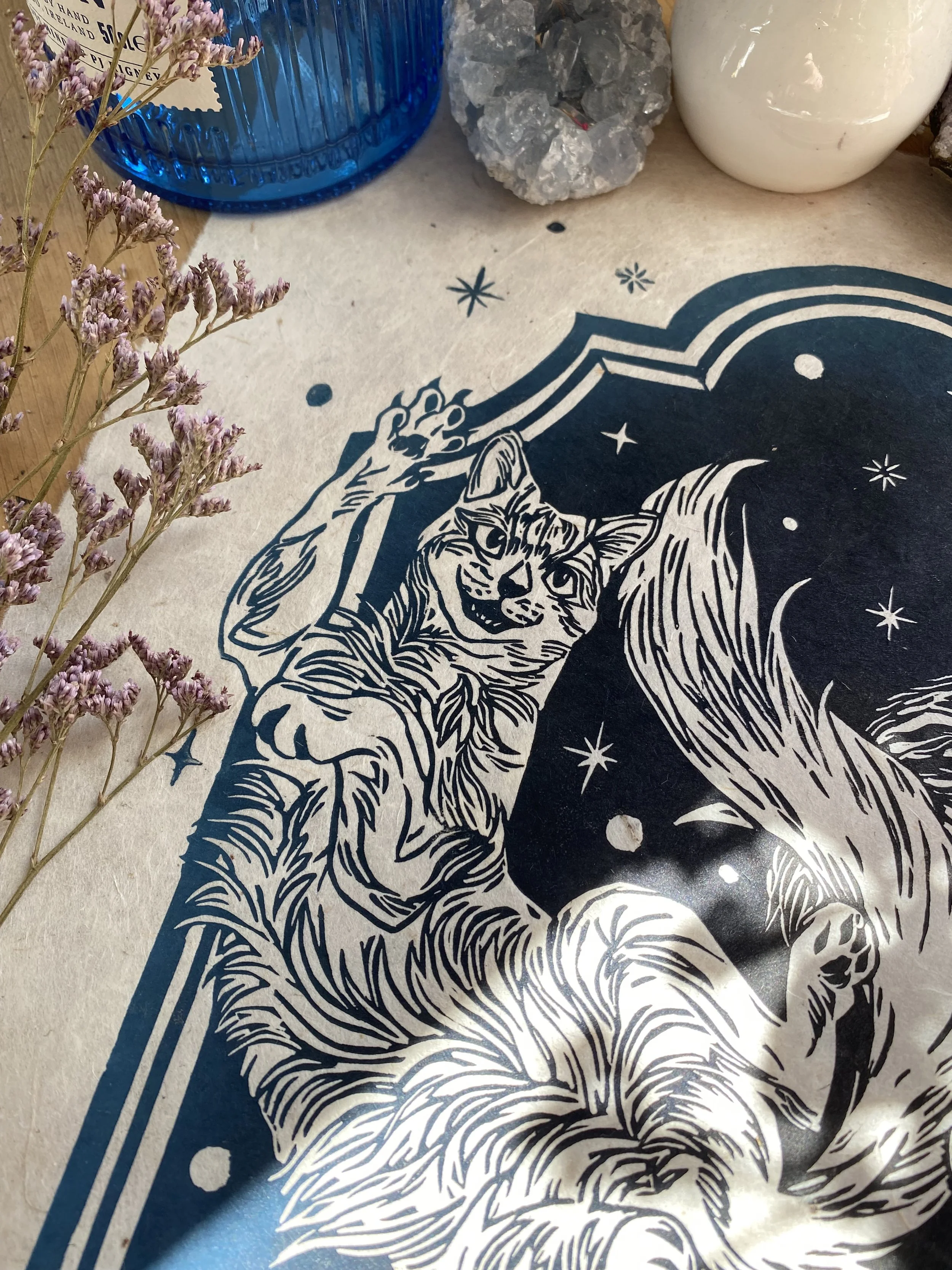The linocut and print is a handcrafted medium so colours as well as details, such as handmade paper, may vary slightly.