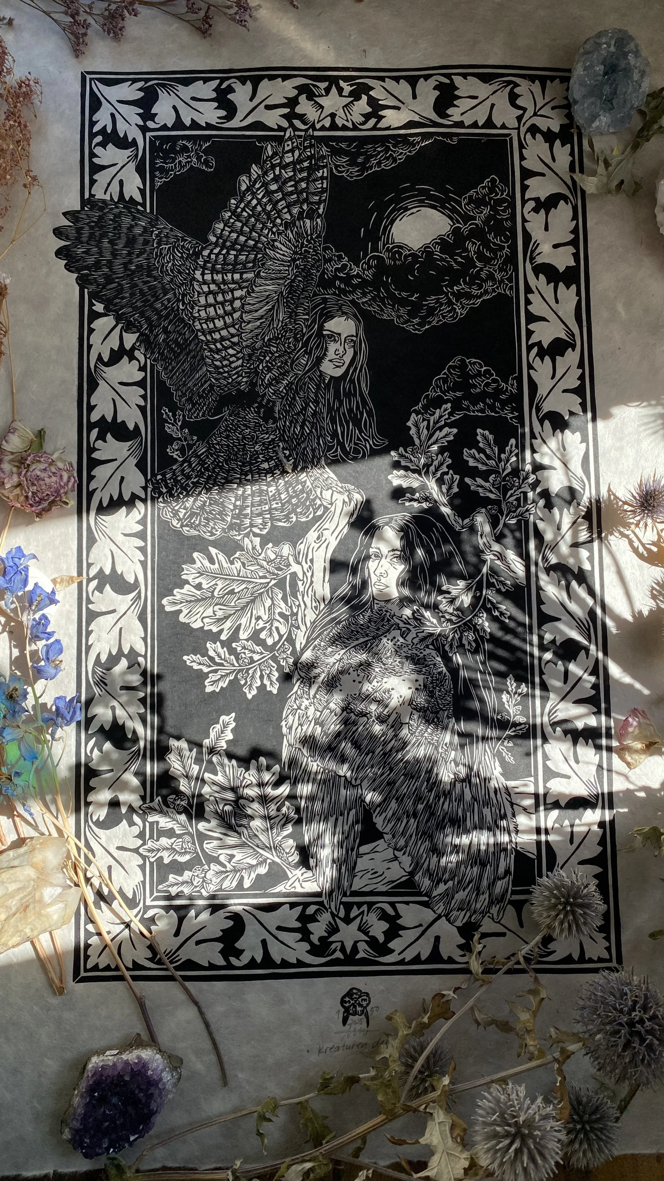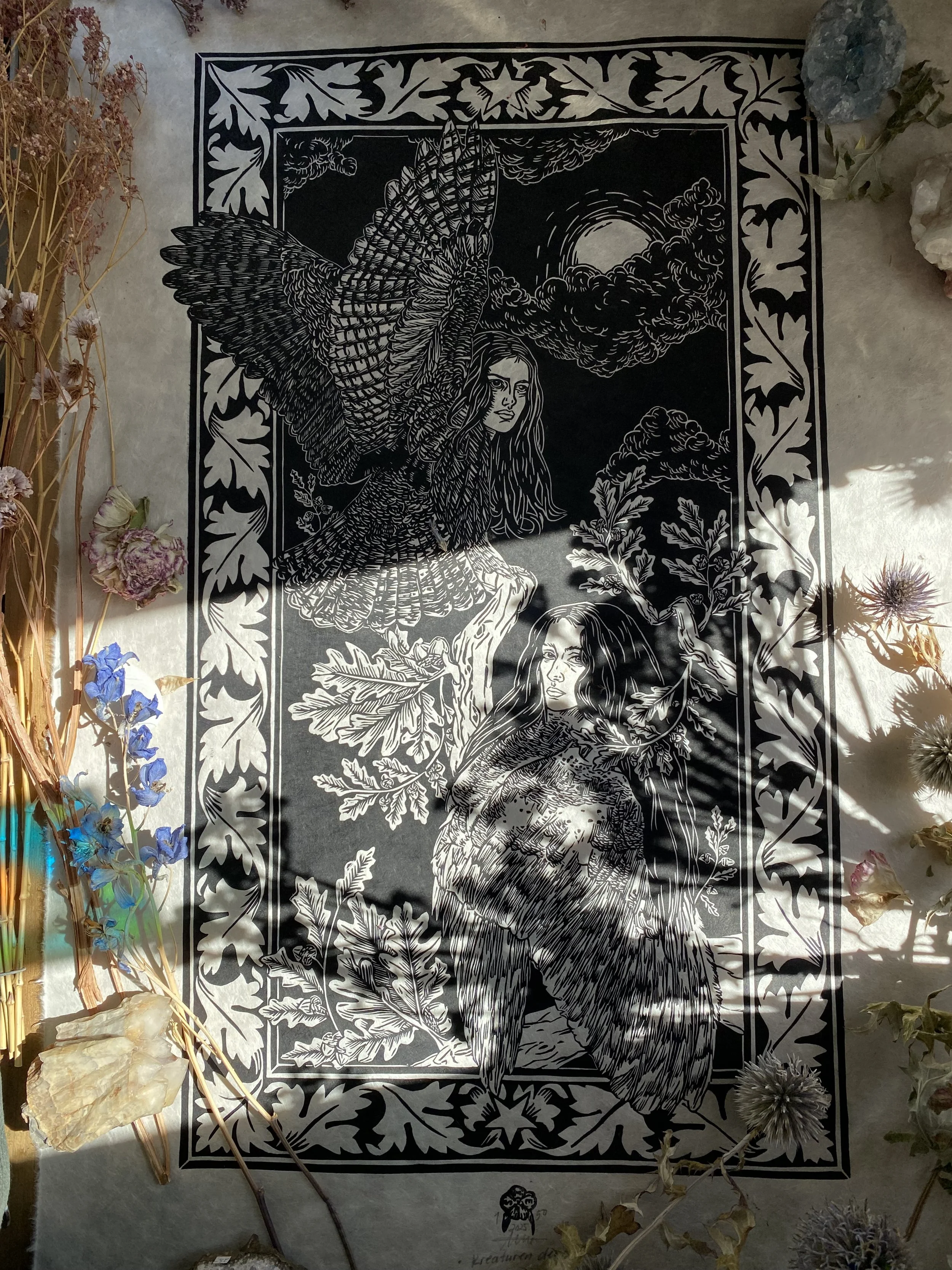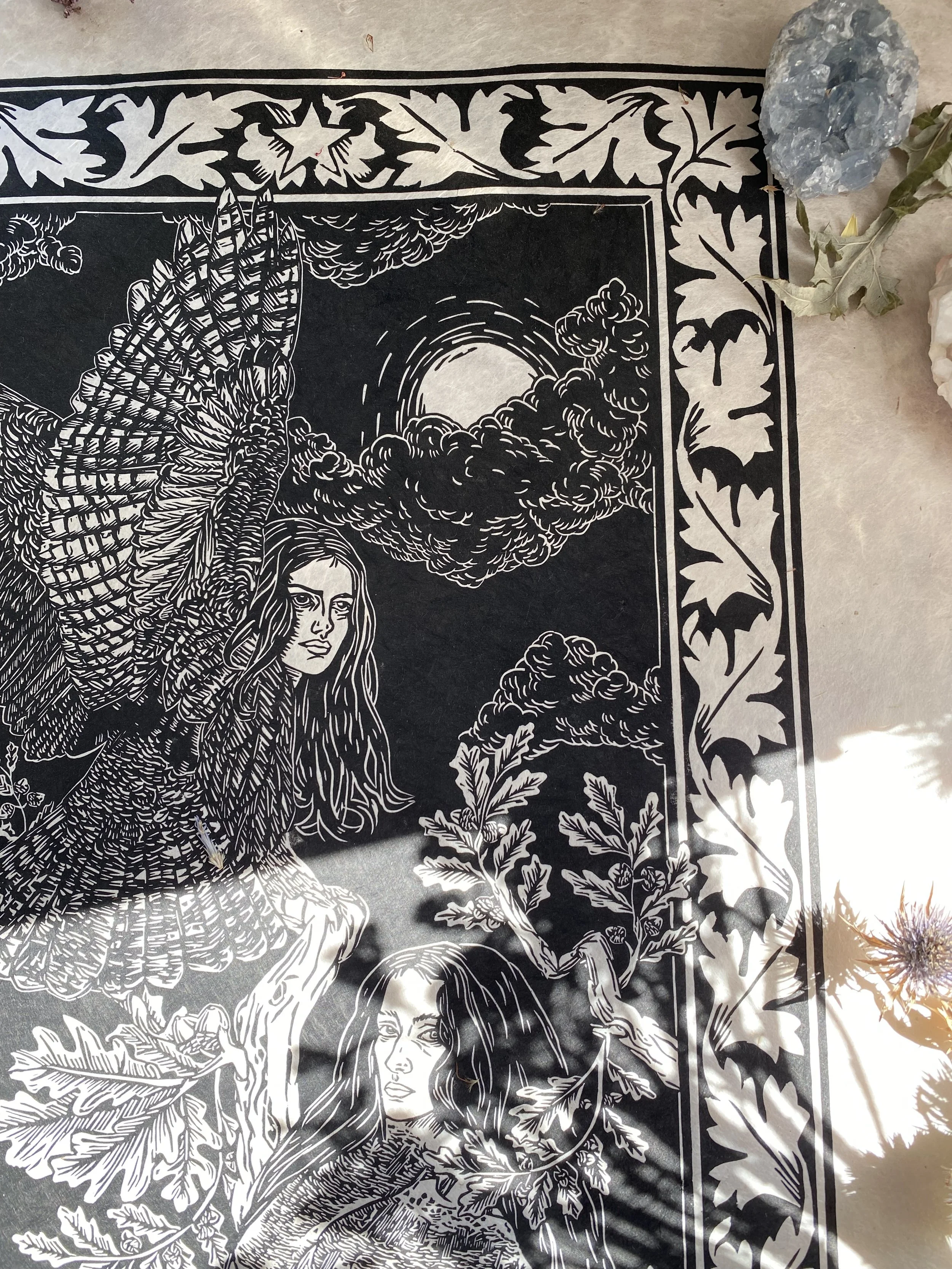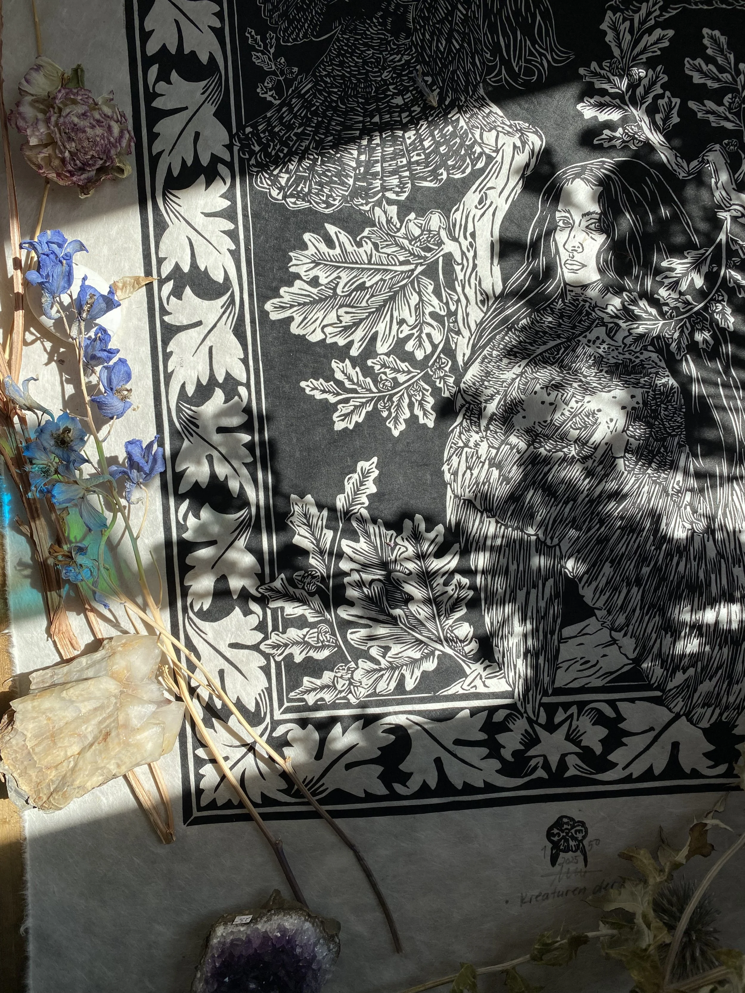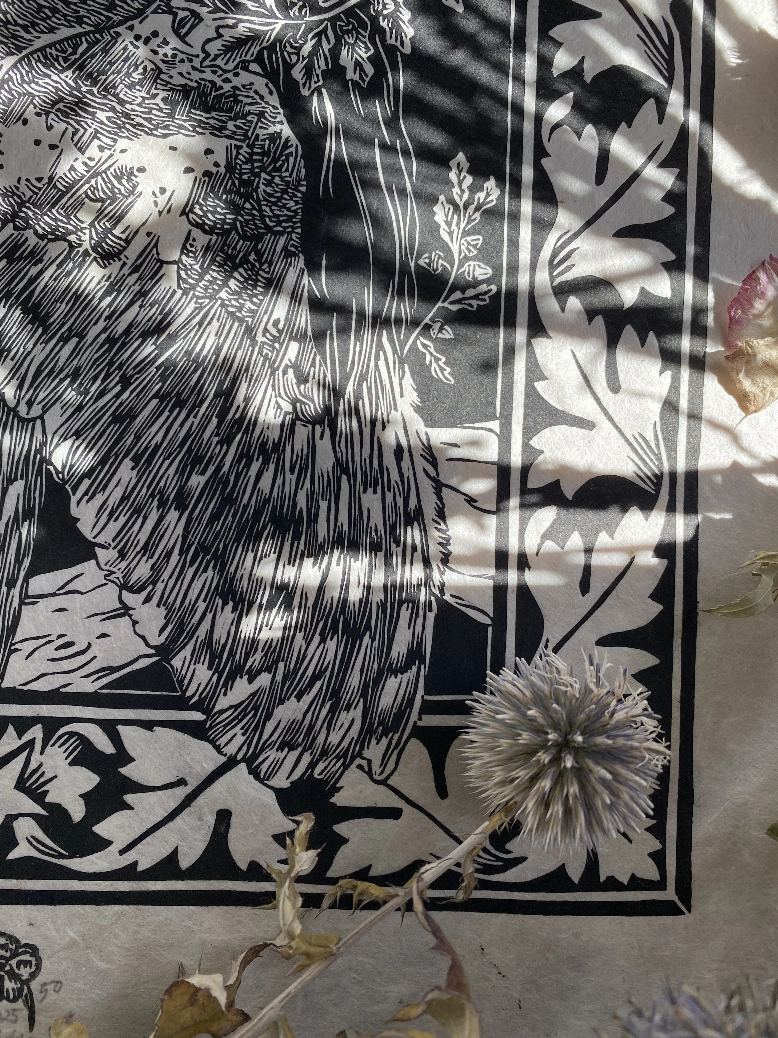 The linocut and print is a handcrafted medium, so colours as well as details, such as handmade paper, may vary slightly.