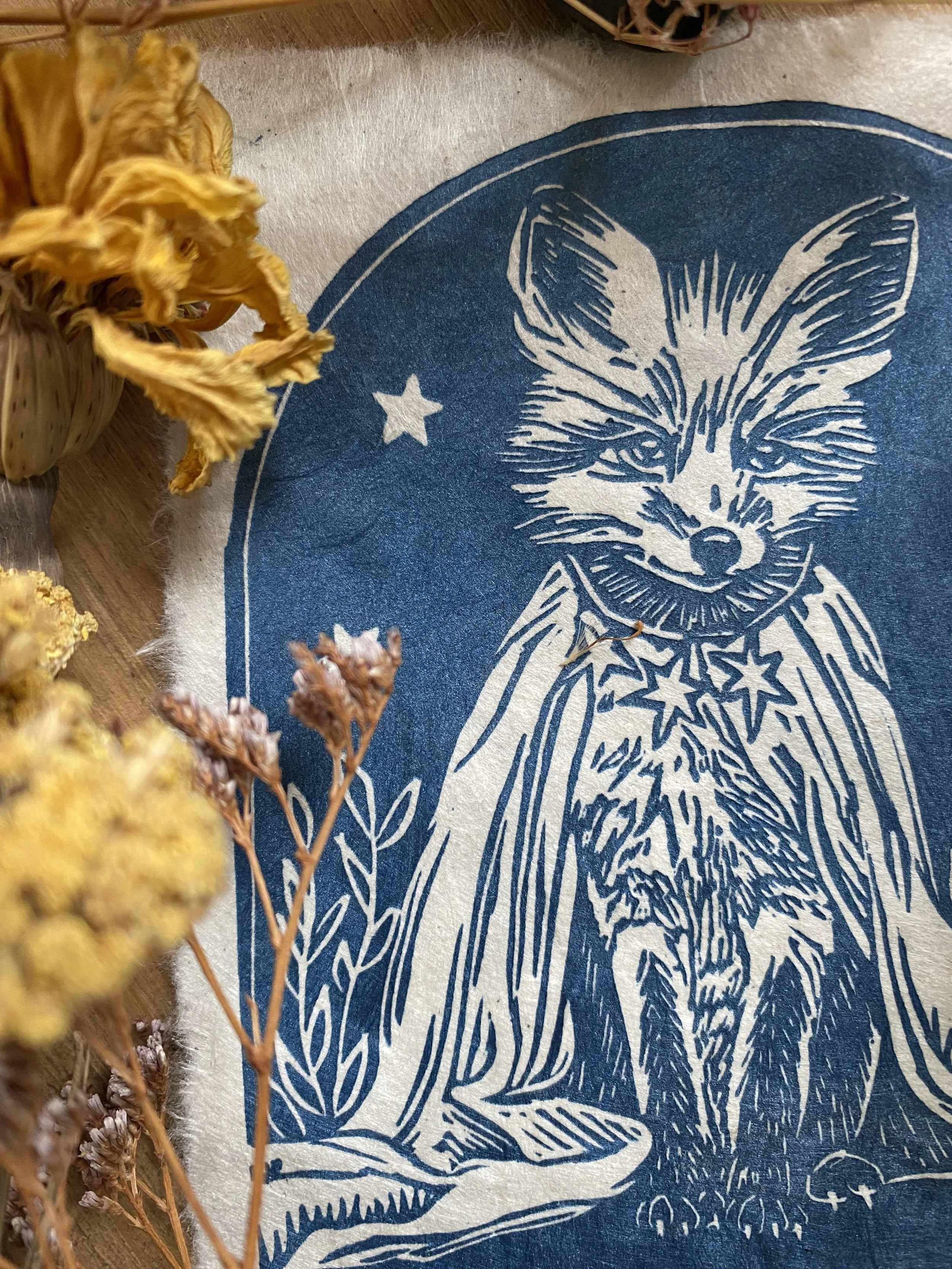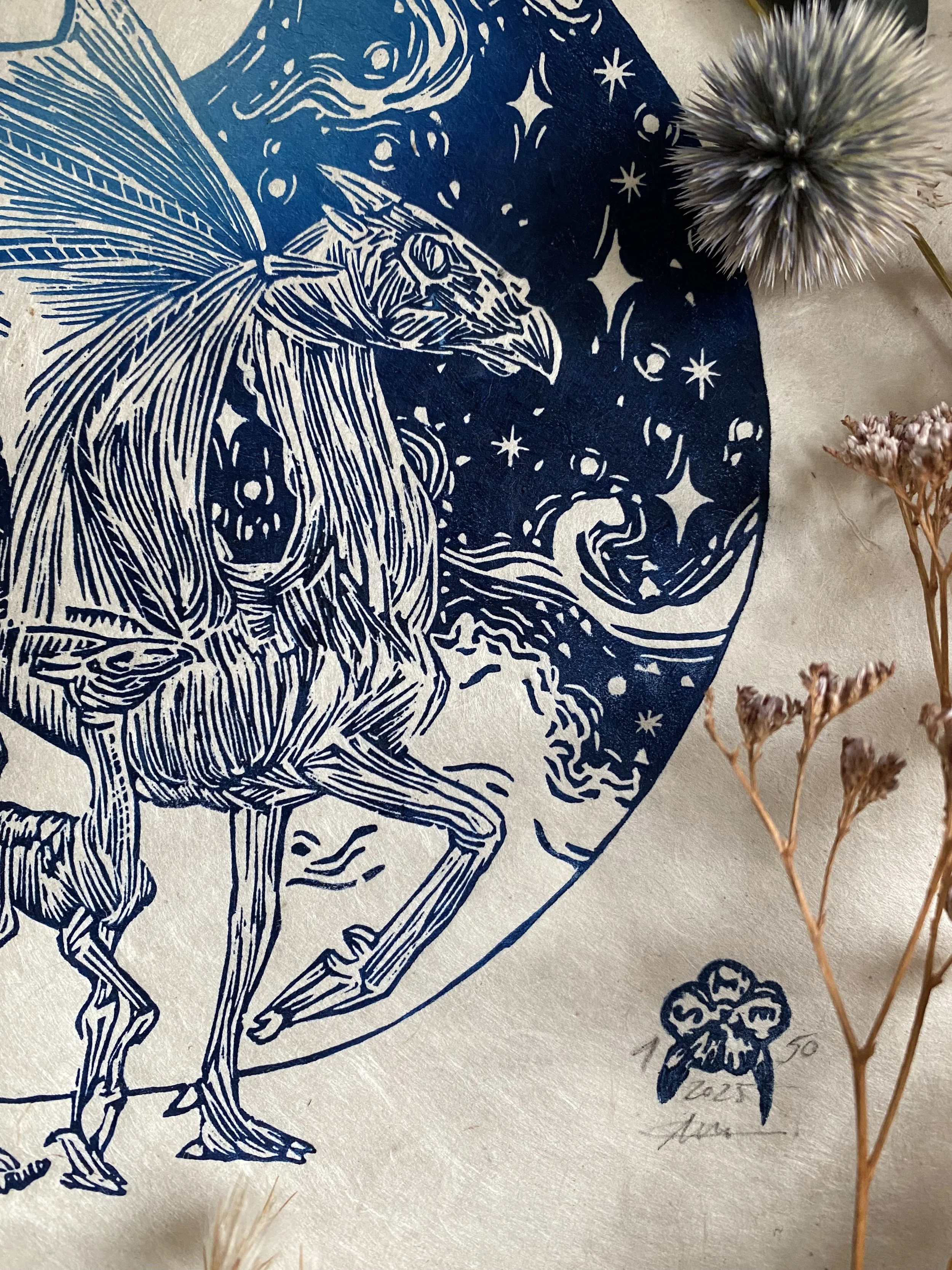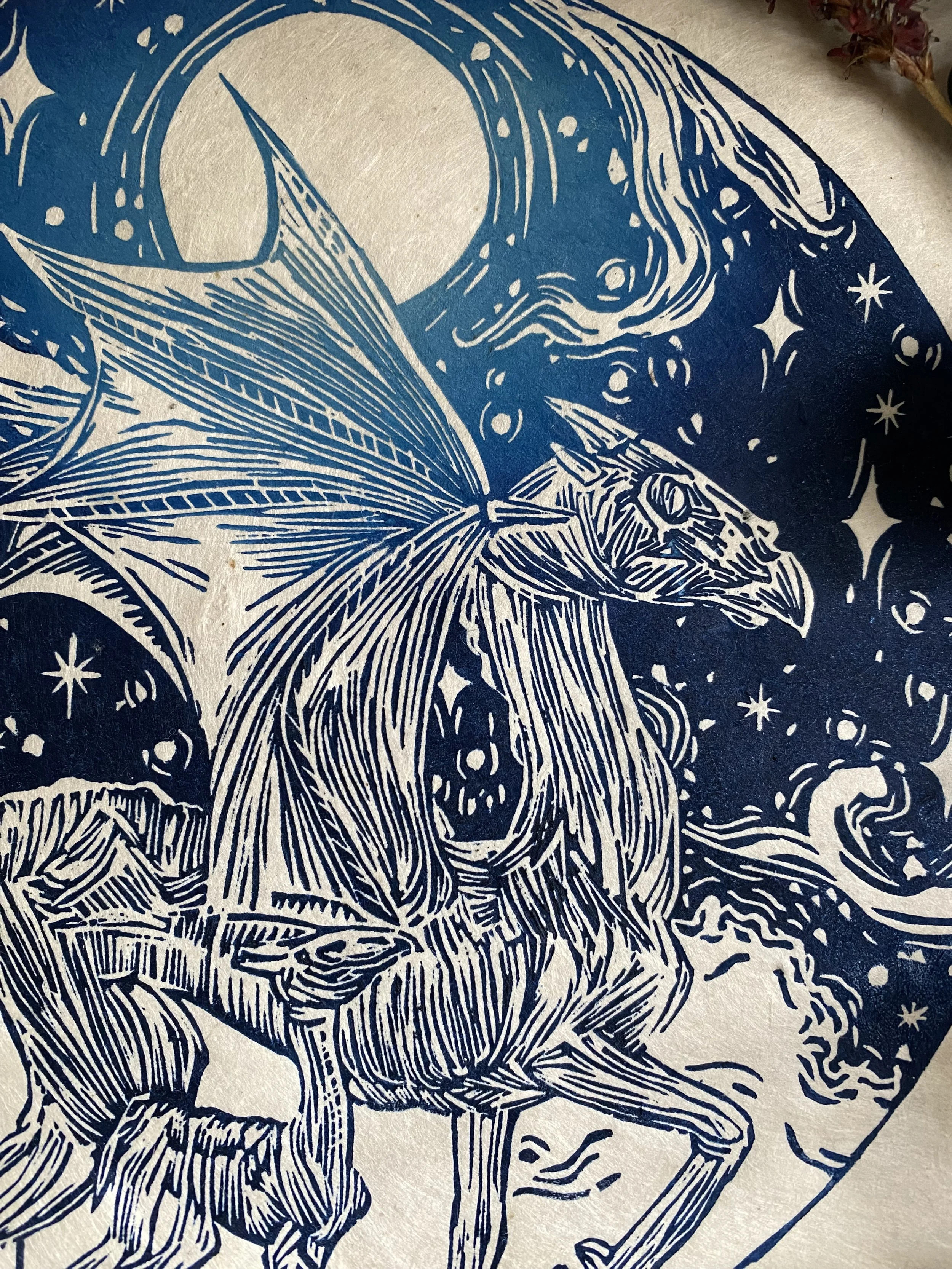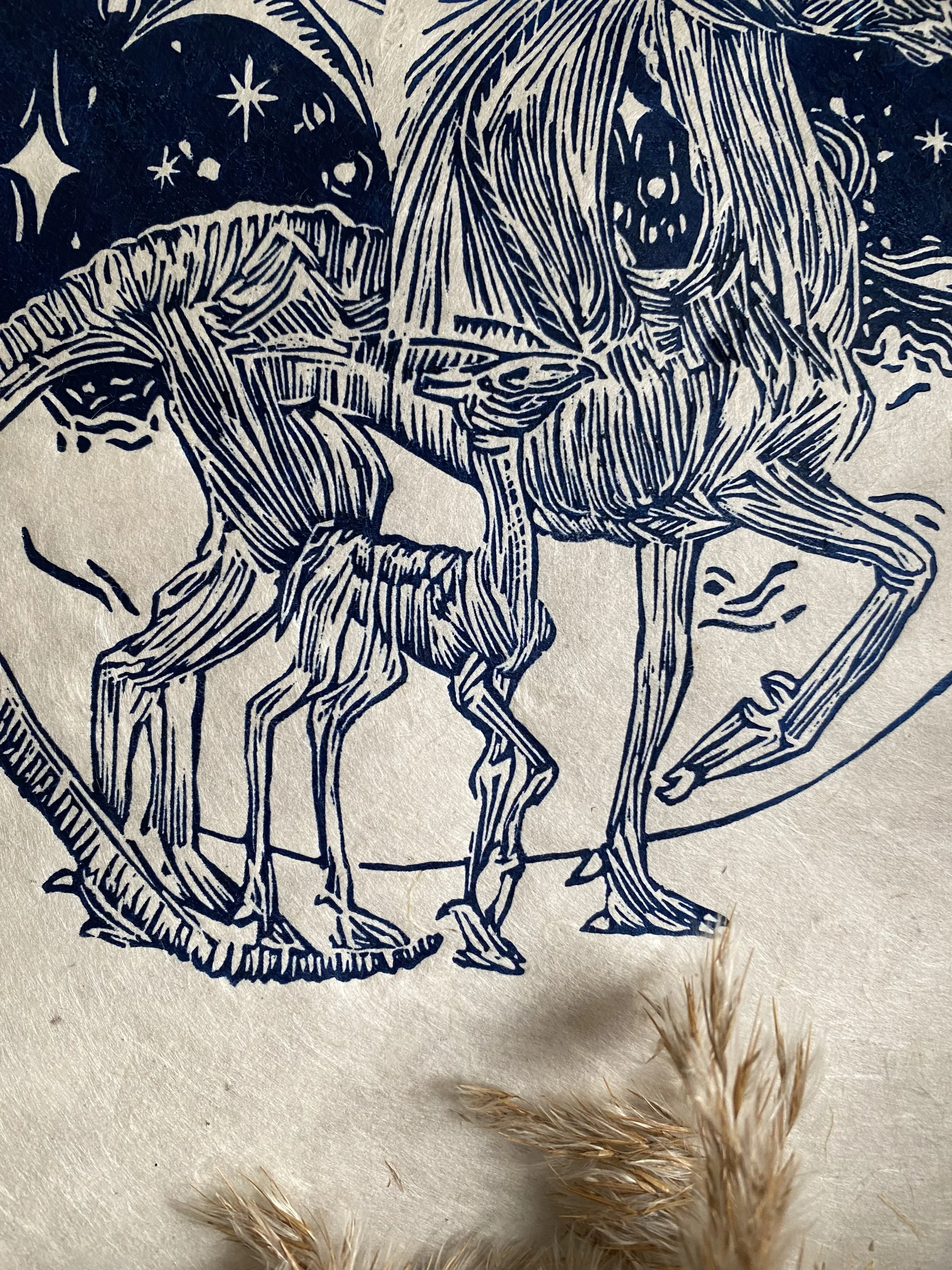 The linocut and print is a handcrafted medium so colours as well as details, such as handmade paper, may vary slightly.