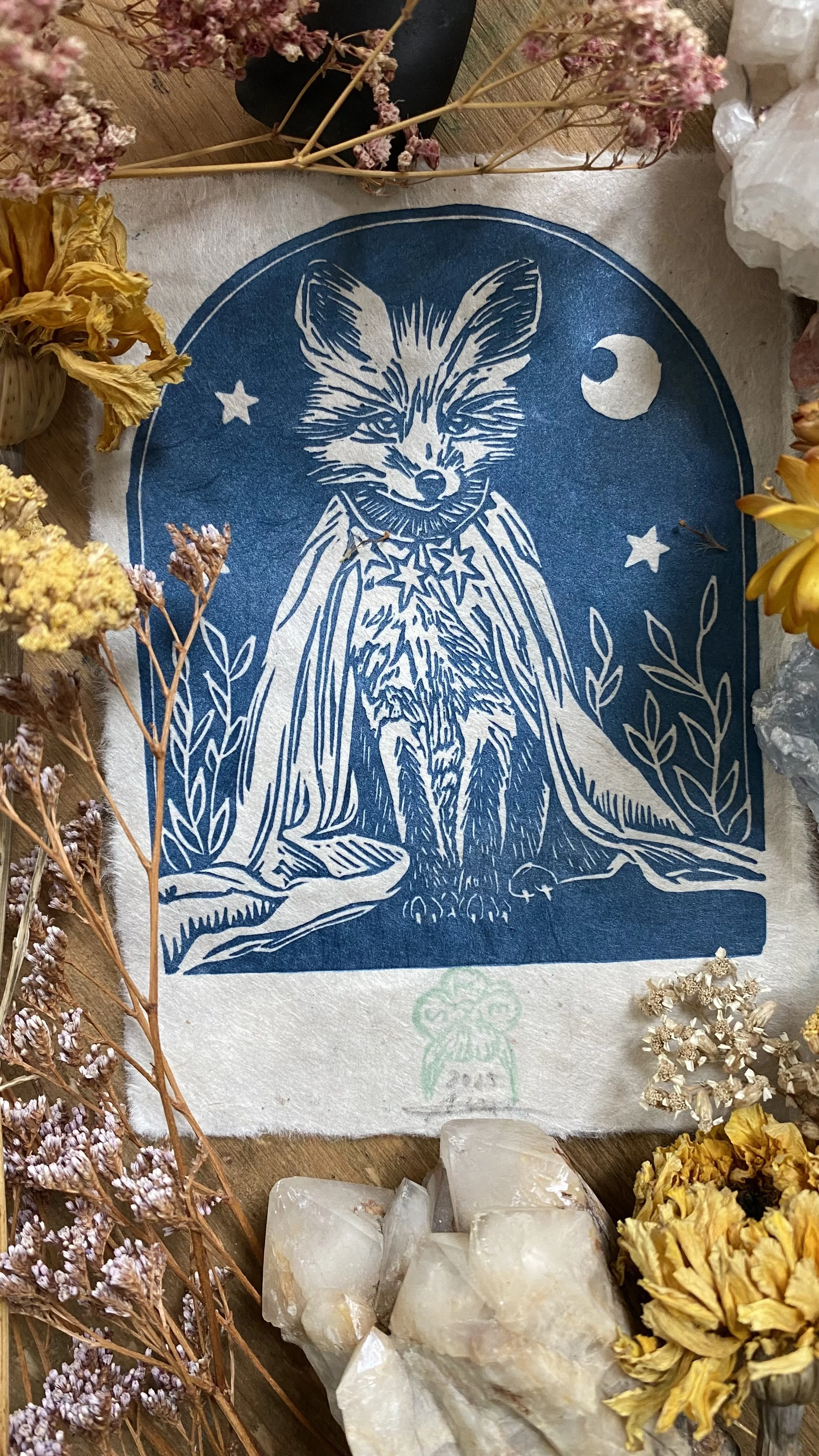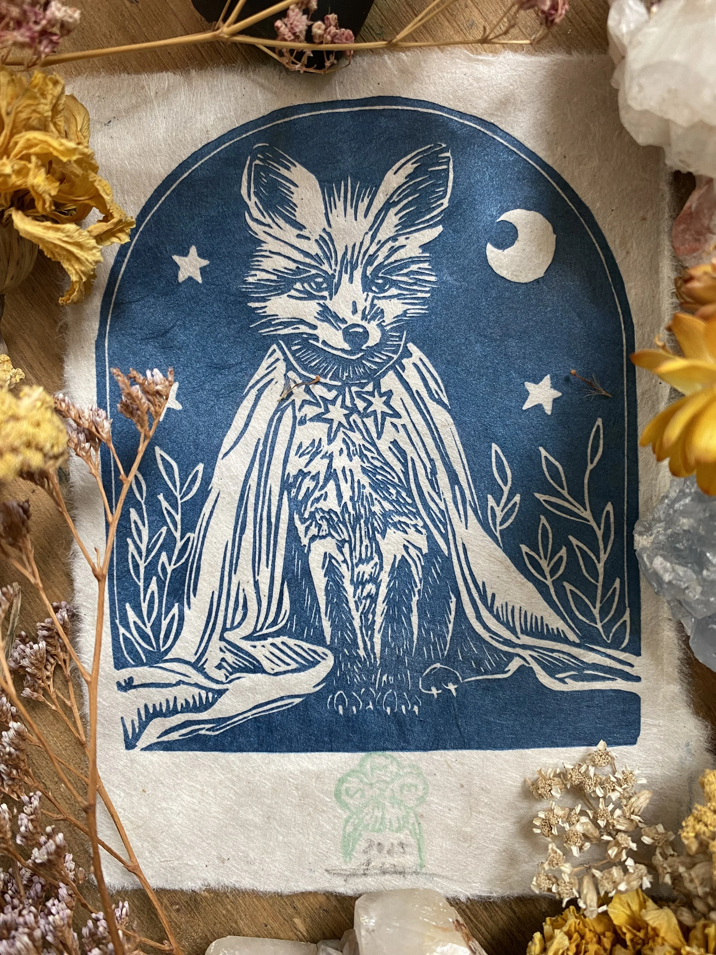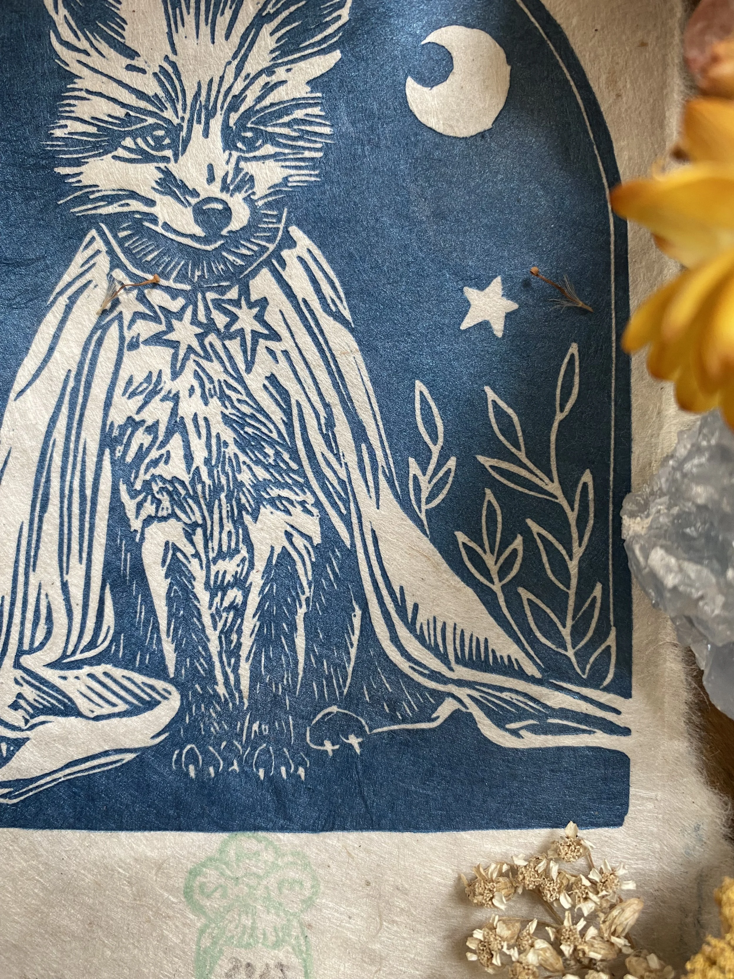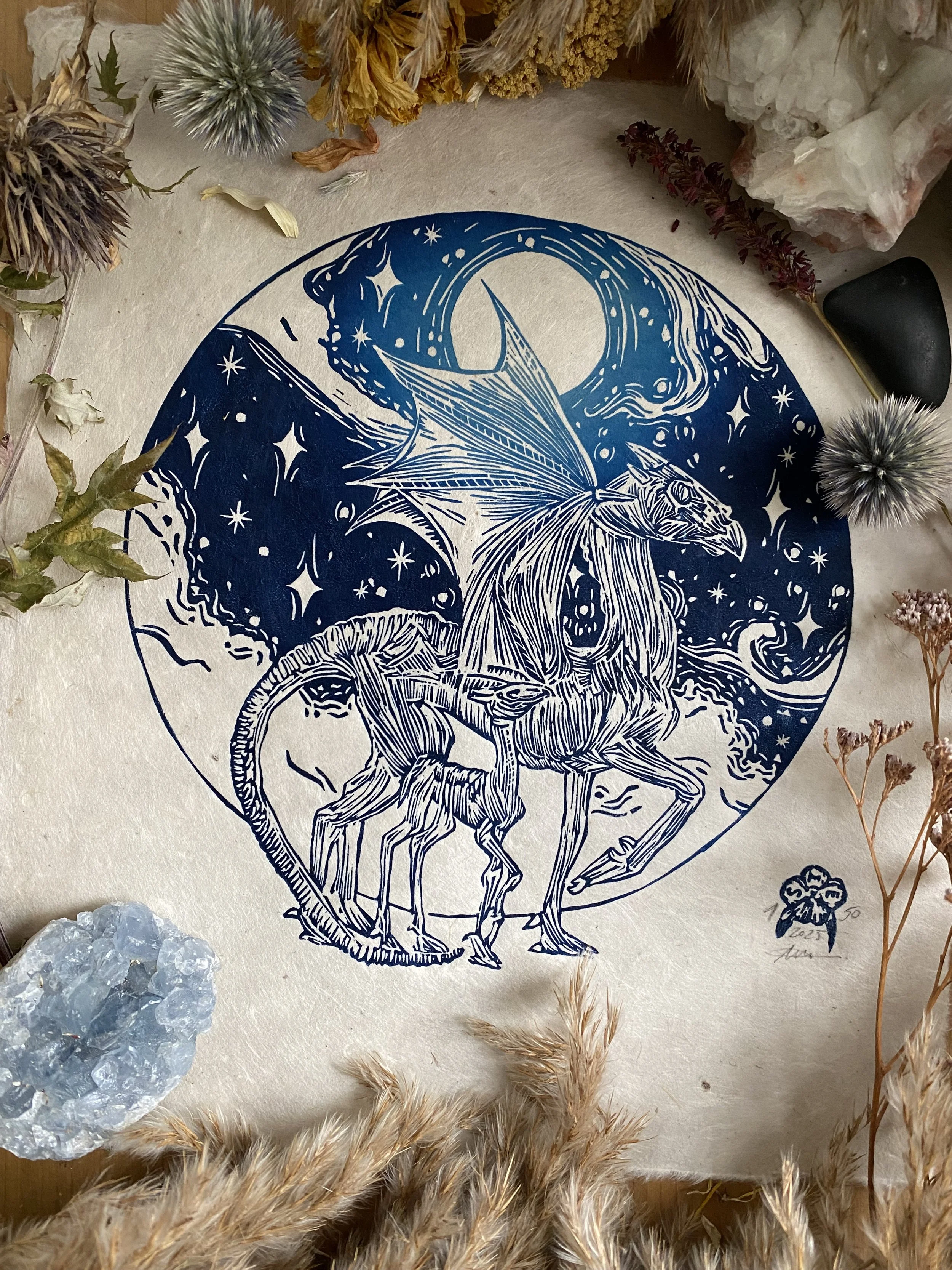 The linocut and print is a handcrafted medium so colours as well as details, such as handmade paper, may vary slightly.